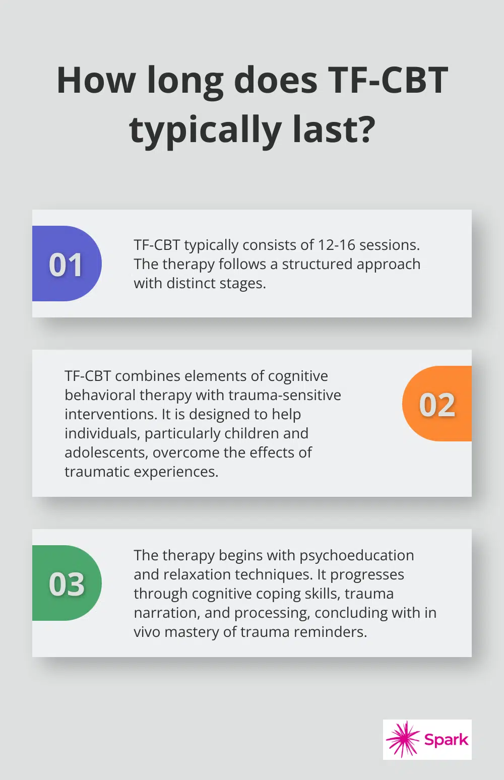 TF-CBT typically consists of 12-16 sessions and follows a structured approach. The therapy begins with psychoeducation, where clients learn about trauma and its effects. This is followed by relaxation techniques to manage stress and anxiety. As treatment progresses, clients work on cognitive coping skills, trauma narration, and processing. The final stages focus on in vivo mastery of trauma reminders and enhance safety and future development.